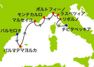 バルセロナ 到着後、現地日本語係員と送迎車にて港へ移動 港到着後、『オーシャニア・リビエラ』 乗船手続き バルセロナ (スペイン) 出港 |